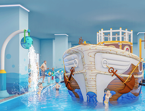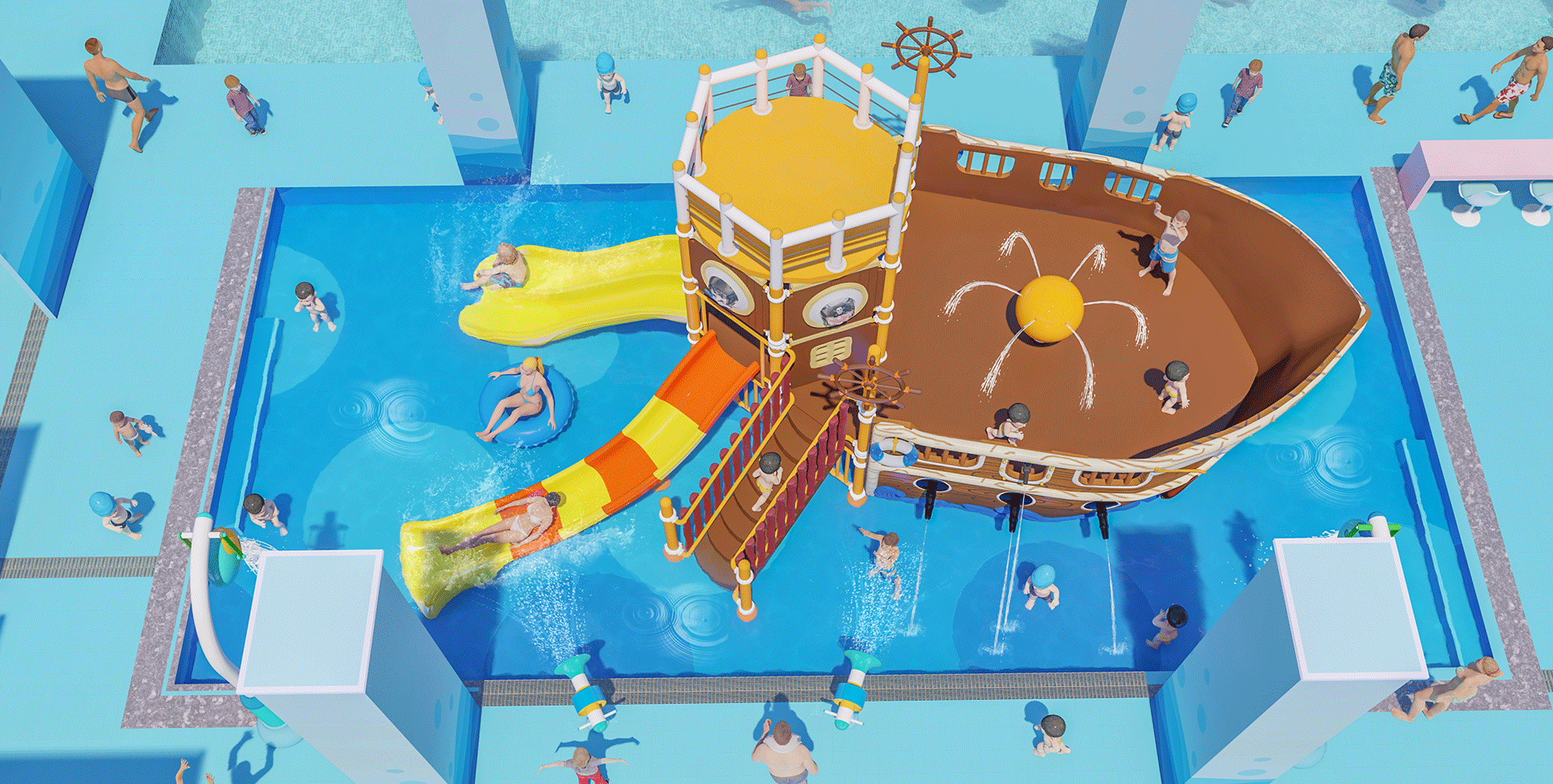 項目簡介:在馬來西亞,牧童設(shè)計師將Alex游泳池變?yōu)橐蛔?292平方英尺的海盜主題水上樂園。設(shè)計以一艘多層海盜船為核心,配備雙滑梯、互動水炮及安全攀爬平臺,為3-12歲孩子開啟沉浸式的海上冒險。 水上樂園布局精巧,敘事性強,在有限空間內(nèi)融合噴水、滑行與攀爬等多種玩法,激發(fā)孩子的想象力與社交互動。它是社區(qū)、酒店度假村打造主題水上空間的完美典范,證明小空間同樣能產(chǎn)生巨大的游樂影響力。