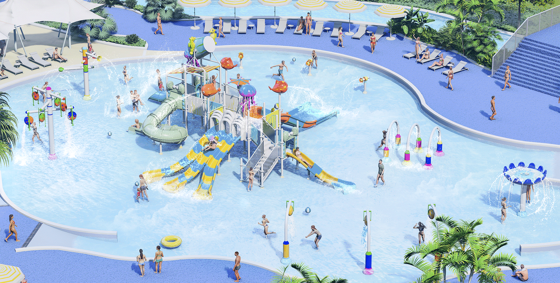 以“夢幻海洋王國”為主題,通過高飽和度的繽紛色彩與擬態(tài)海洋生物造型,構(gòu)建充滿活力與想象力的玩水環(huán)境。設(shè)計注重親子共同參與,在嬉水互動中促進情感聯(lián)結(jié)與成長陪伴。
