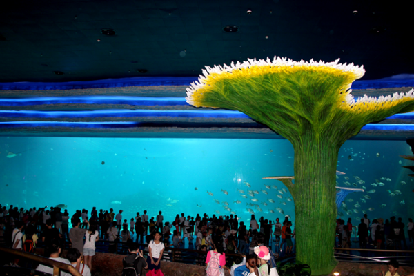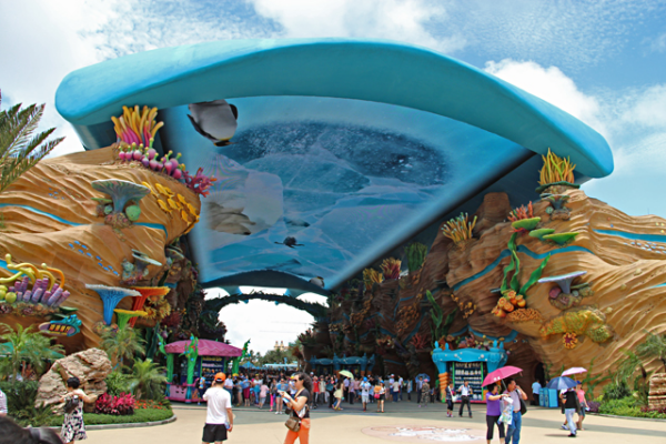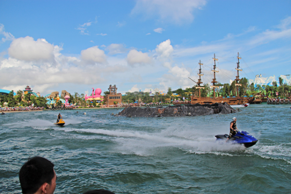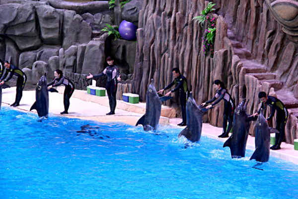 入口處的海洋大街,穹頂是魔鬼魚的造型,天幕不停播放色彩斑斕的海底奇觀。牧童家人結(jié)伴而行,尋找著探索著各種好玩的項目,動感刺激的鸚鵡過山車,海豚、海豹聰明機智幽默詼諧的表演,還有海洋霸主之稱的白鯨白鯊表演,然后來到我們的野生北極探險區(qū),大西洋區(qū),還有一群來自國外的專業(yè)的特技演員表演水上摩托。最奇妙的是晚上還有一場視覺盛宴——大馬戲團,絕妙的燈光、優(yōu)美的音樂、可愛的動物們、技藝非凡的演員們把我們帶入了一個奇幻而美妙的世界,