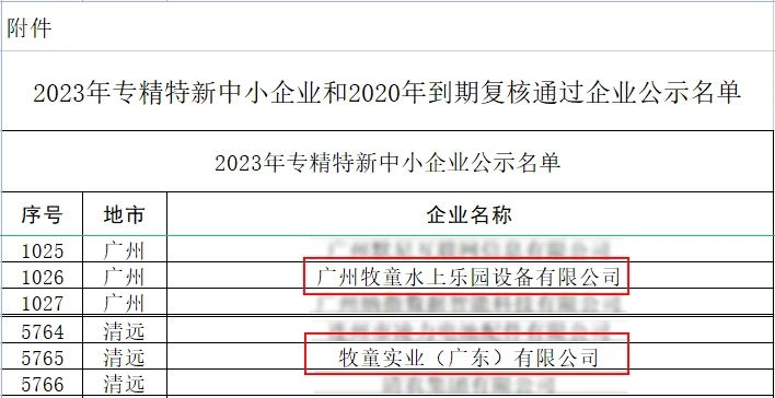 近日,牧童集團旗下子公司又傳捷報:2023年12月12日,廣東省工業(yè)和信息化廳發(fā)布《關(guān)于2023年專精特新中小企業(yè)和2020年到期復(fù)核通過企業(yè)名單的公示》,牧童集團旗下牧童實業(yè)(廣東)有限公司、廣州牧童水上樂園設(shè)備有限公司兩家子公司獲得了廣東省“2023年專精特新中小企業(yè)”認(rèn)證!